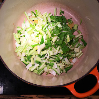 Add the leafy parts to the pan, a couple more glugs of olive oil and mix well to cover the leaves in the oil and onion mix. Your pan will probably be quite full at this point - don't worry, it will cook down to less than 1/4 of volume. Season with salt & pepper (and a bit of chilli if you like), and add just a splash of water to prevent sticking (really just a splash, you want to avoid boiling the greens).Put the lid on and simmer gently until wilted - about 10 mins.